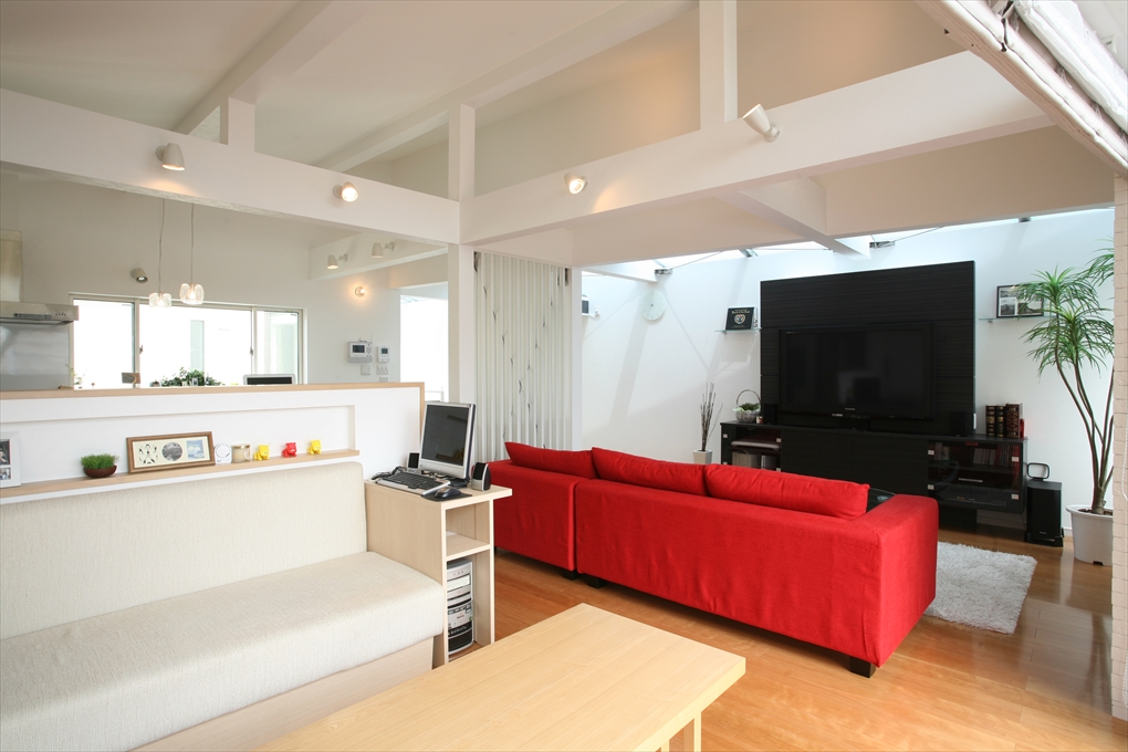 「江戸川の ガレージハウス 」・東京都江戸川区にある間口9mに対して奥行き40mという変形地に建つガレージハウス。将来の買い替えに備えて幅3m30、奥行き5m50という大きさのビルトインガレージがある。外壁の一部に石がランダムに貼られ、表情を豊かにしている。奥行きのある敷地を生かし、中庭・スキップフロアと変化に富んだ空間構成となっている。敷地が川沿いにあるため、1階と2階をつなぐウッドデッキからは川も眺められ、ゆったりとした時間を過ごすことができる。