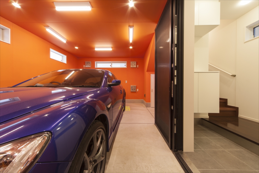 「杉並の ガレージハウス 」・東京都杉並区にあるビルトインで1台分のガレージのある家。ガレージ前には駐車スペースがある。愛車の色が映えるようにガレージ内の壁をオレンジ色にすることによりクルマの青さに深みが増している。ガレージドアには木製のオーバーヘッドドアを採用。またオーバーヘッドドアの一部が扉となっており、人の出入りはスムーズにできる。建具の一部には思い出の品があしらわれている。