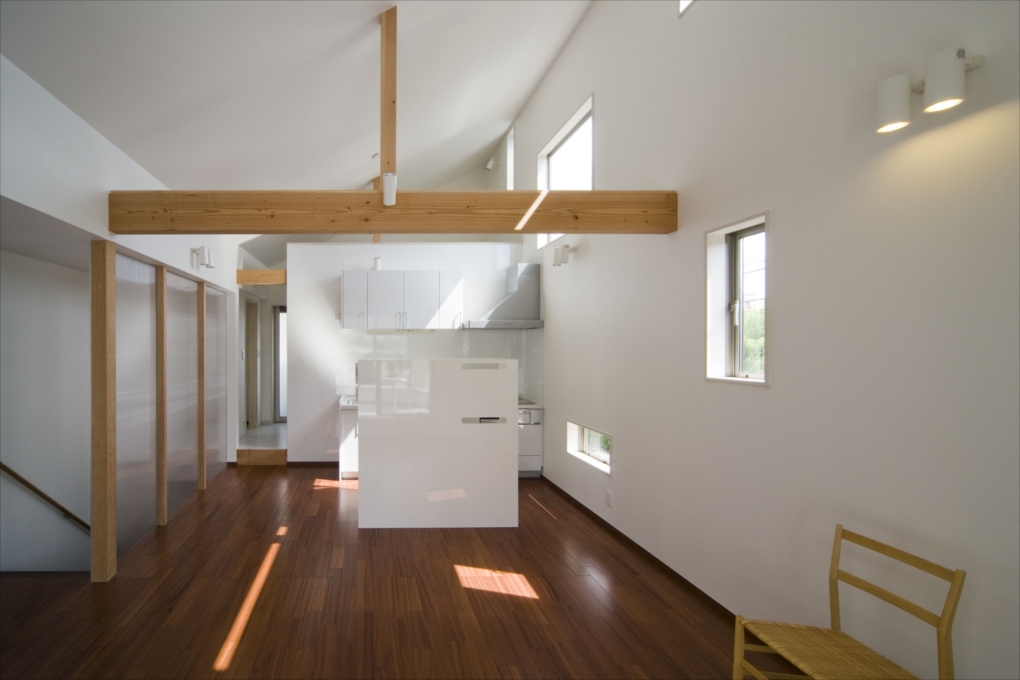 「高槻の ガレージハウス 」・大阪府高槻市にあるクルマ2台を並列で格納できるガレージハウス。ガレージにはクルマのほかに自転車や季節で使うものを収納するスペースがある。2階へはガレージの奥にある階段を使う。外観はシンプルだが、室内は明るく、天井の高い2階LDKは解放感のあるスペース。LDK横の屋根のある広いテラスはアウトドアリビングとしても利用できる。
