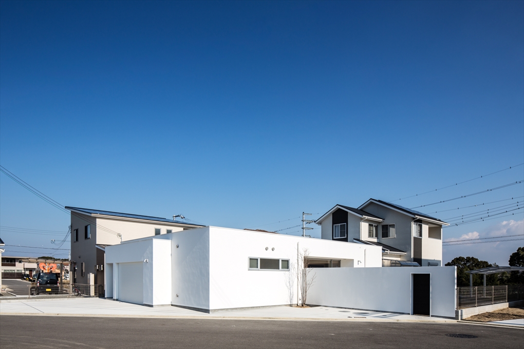 「泉南のバイク ガレージハウス 2」・大阪府泉南市にあるバイクを複数台格納できる専用のガレージを持つ、白いハコのようなバイクガレージハウス。約94坪の敷地にゆったりと平屋で建てられている。ガレージの愛車は中庭を介してLDKから眺められる。建築家オリジナルデザインのアイランドキッチンを採用している。