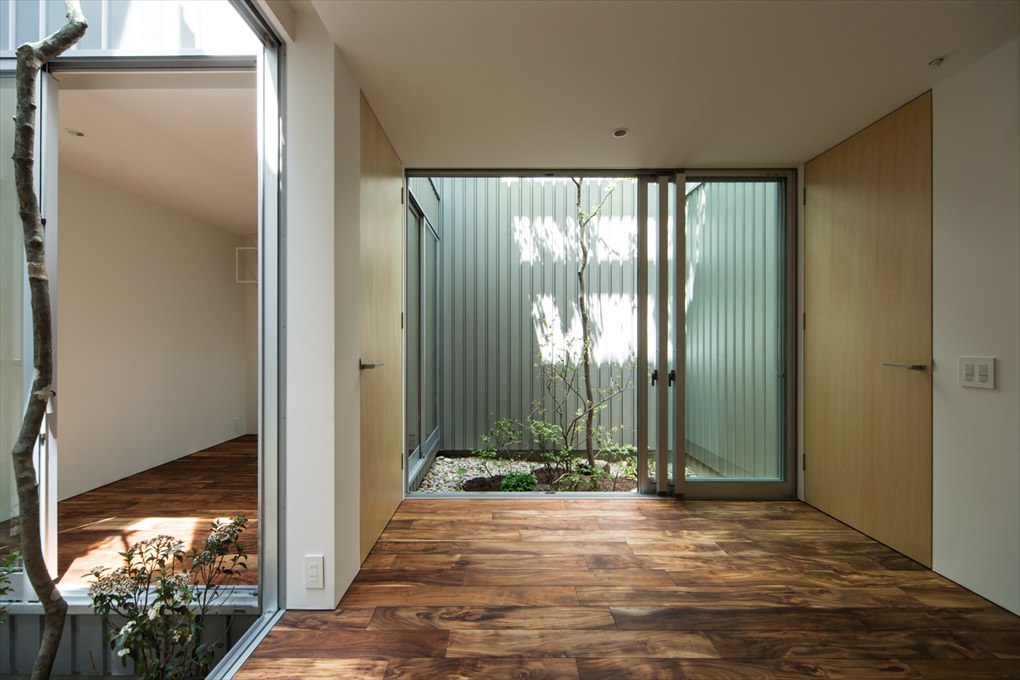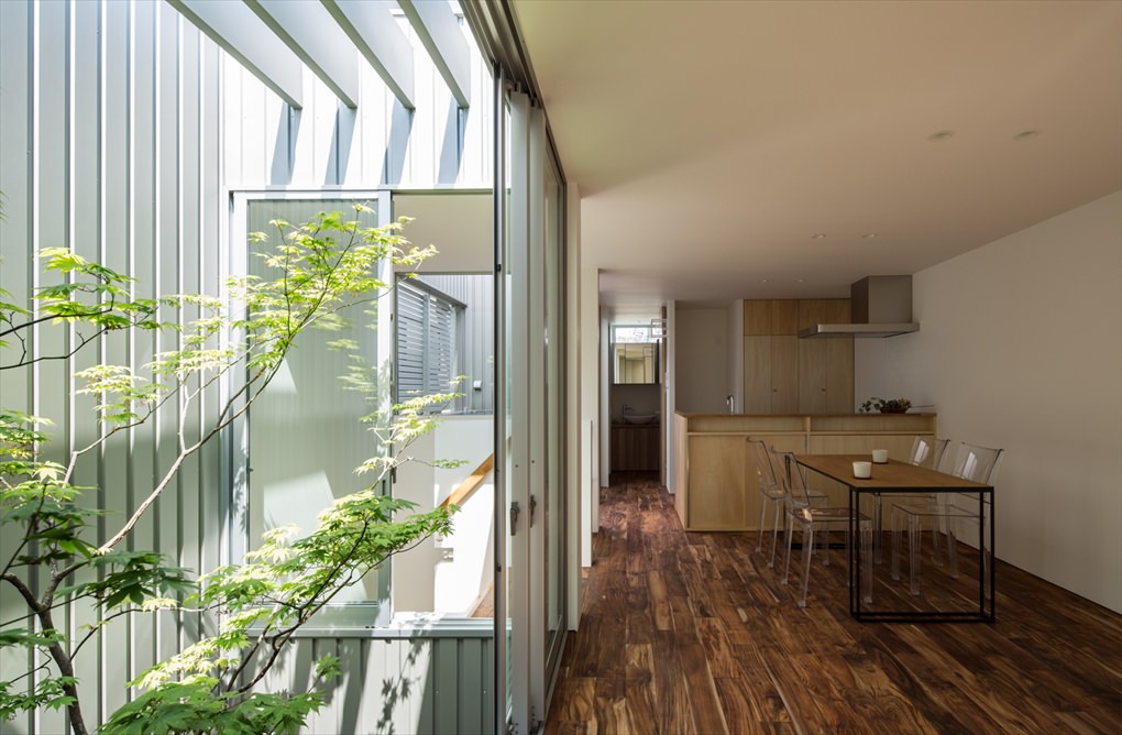 「鳳の ガレージハウス 」・大阪府堺市にある敷地面積約19坪の狭小地に建てられたガレージハウス。クルマ1台をビルトインできる。ガルバリウム鋼板の外壁で覆い、窓をなくしプライバシーを確保。2箇所ある壁に囲まれた中庭から通風と採光を確保。外のからの視線を気にすることなく窓が配置でき、外観デザインからは想像できないほど開放的な室内となっている。デザイン性が高く、海外の建築賞も受賞。