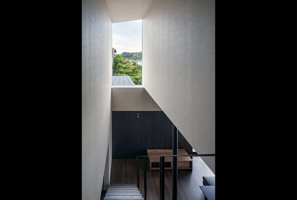 「奈良の ガレージハウス 」・クルマ2台を並列駐車できるインナーガレージのある家。ガレージ奥に配置された少し床が高くなったLDKからガラス越しに見渡すようにガレージ内の愛車をソファーでくつろぎながら眺めることができる。敷地が高台にあるので、1階、2階どちらからも眺望が楽しめるように大きな窓が設けらている。また、敷地内の高低差を活かし、少し下ったところにアウトドアリビングとしても利用できる屋根のあるスペースがある。